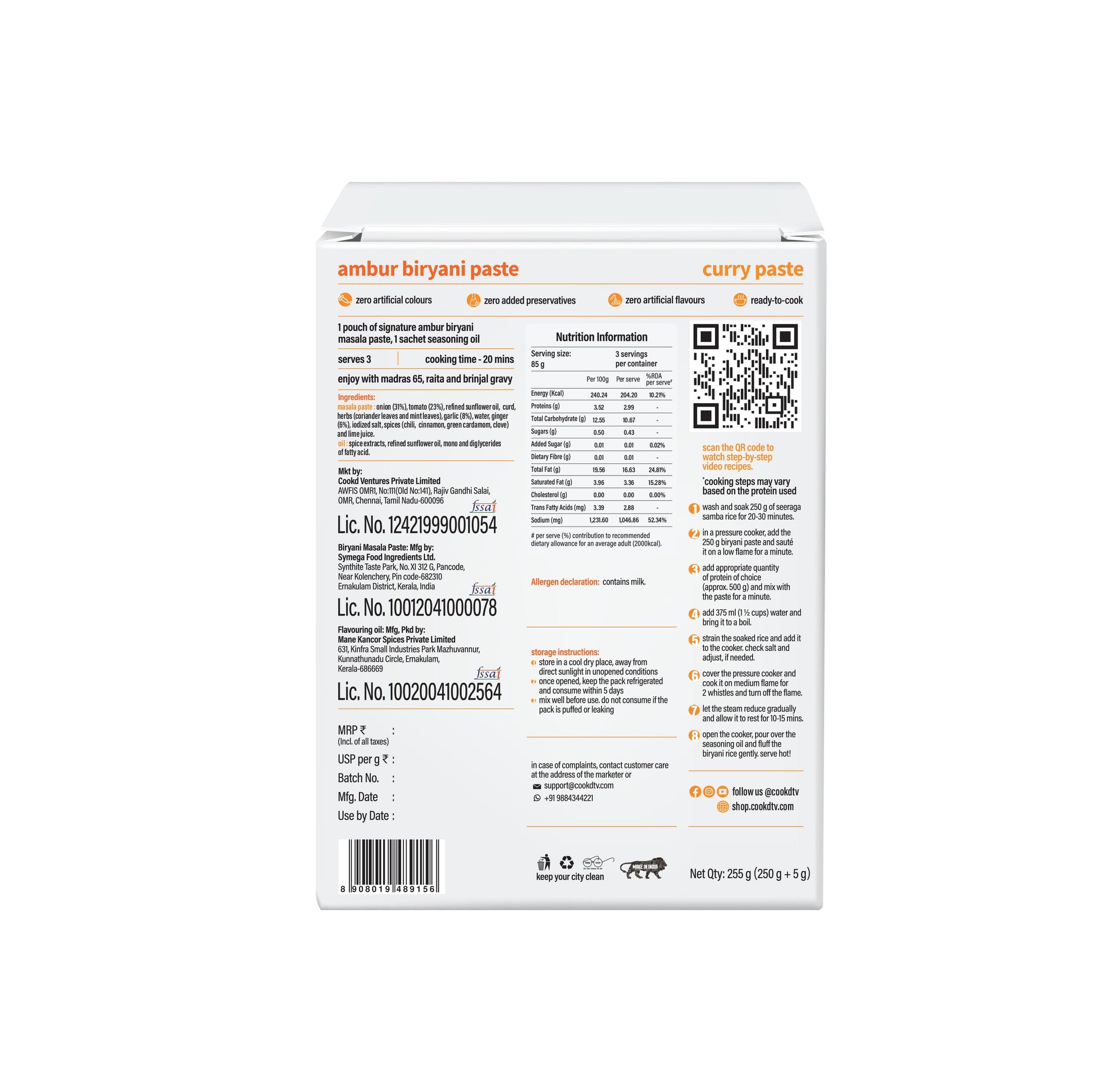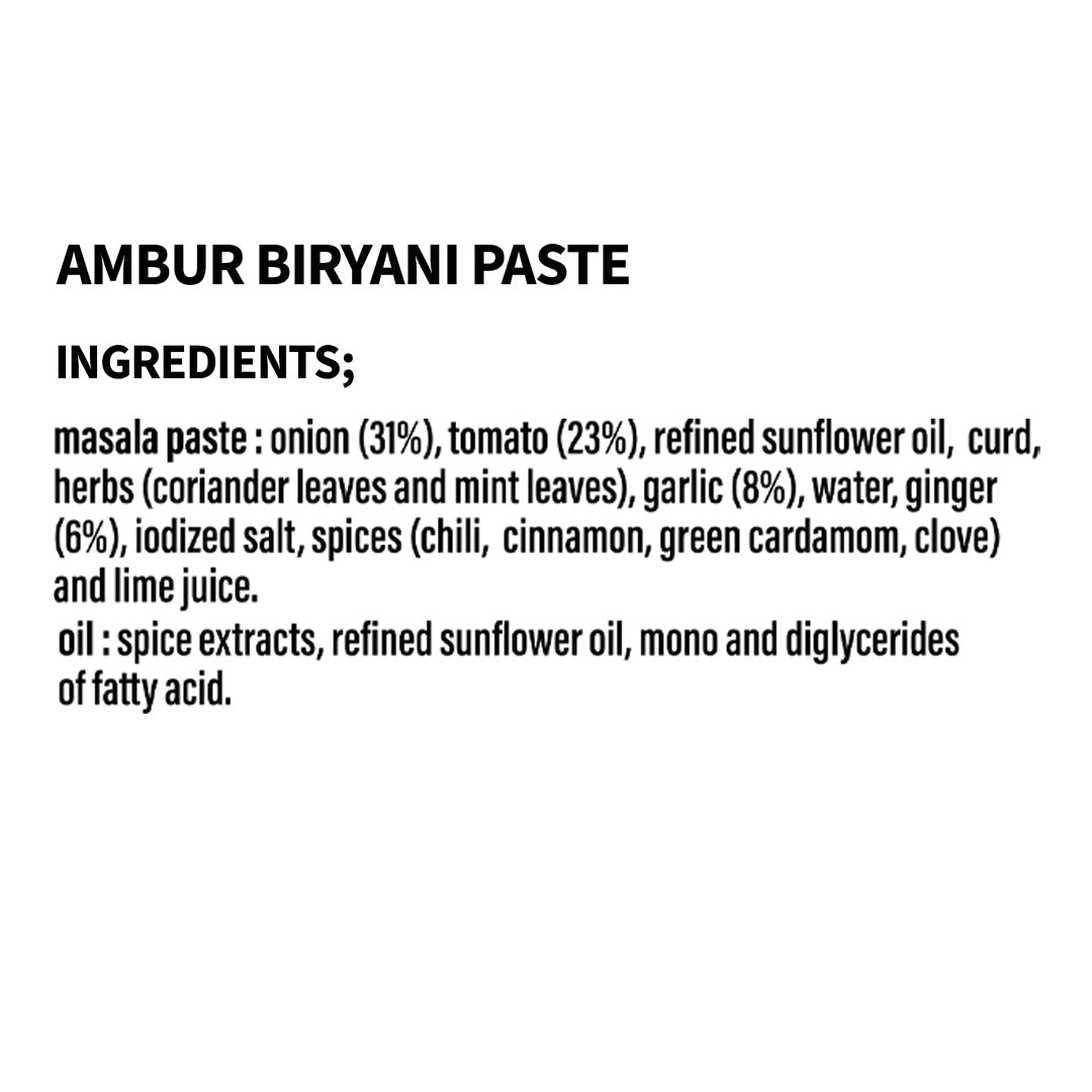 Ambur Biryani Paste - Create a royal Nawabi feast at home with our Ambur Biryani Kit. This 505g pack (250g + 250g + 5g) cooks 1.3 kg of aromatic biryani in just 20 minutes and serves 3. Rich, authentic flavours fit for royalty, perfect with chicken, paneer, veggies, mushroom, cauliflower, or meat.
