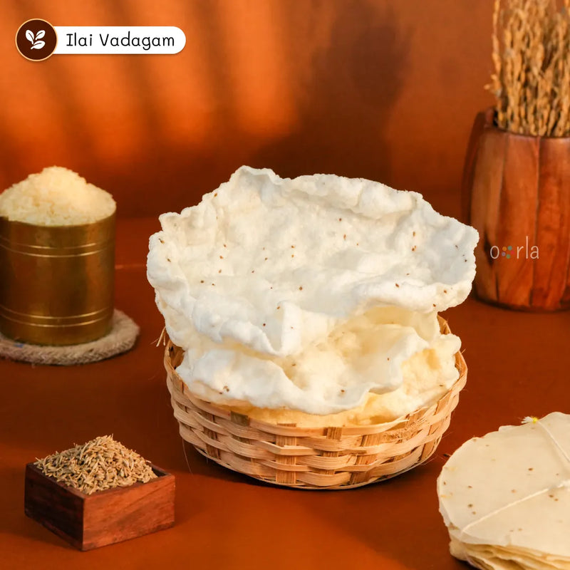 A crunchy tribute to Tamil Nadu's culinary heritage! Oorla’s Appala Petti, sourced from Sri Varaha Foods, Kallidaikurichi, brings you a curated box of handpicked appalams and vadagams made with natural ingredients and traditional recipes from the Thamirabarani region. Inside find Arisi Appalam, Garlic Appalam, Palak Appalam, Tomato Appalam, Ilai Vadagam, Small Onion Thalippu Vadagam, Veppam Poo, Midhuku Vathal, Javvarisi Vadagam, Omapodi Vadagam, Vazhai Thandu Vadagam, Ribbon Vadagam, Vazhai Poo Vadagam — all Sun-dried, aromatic, and irresistibly crispy.