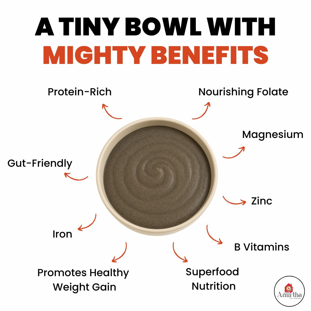 Black Urad Dal Mix - A nutrient-dense mix suitable for all ages above 7 months, Black Urad Dal Mix is rich in protein, folate (B9), iron, calcium, magnesium, and fiber. It supports healthy weight gain, aids digestion, boosts bone health, and maintains hemoglobin—100% natural with no sugar, salt, maida, or preservatives.