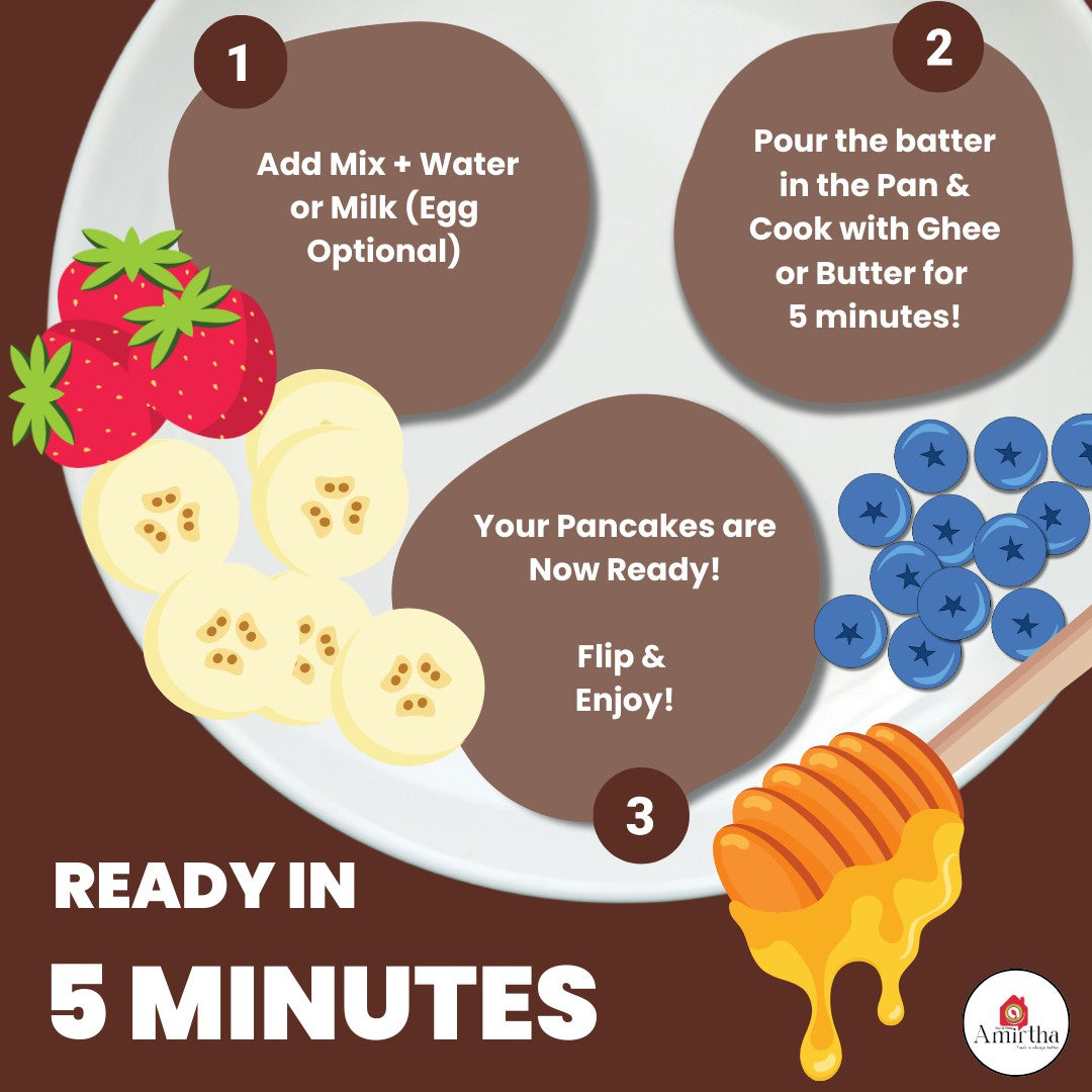 Cocoa Millet Pancake Mix - Enjoy the yummiest Cocoa Millet Pancakes—perfect for kids 1 year+ and loved by all ages. Ready in just 5 minutes, this nutritious snack is rich in protein, omega-3, calcium, iron, magnesium, and zinc. No baking soda, salt, maida, refined sugar, milk solids, or preservatives.