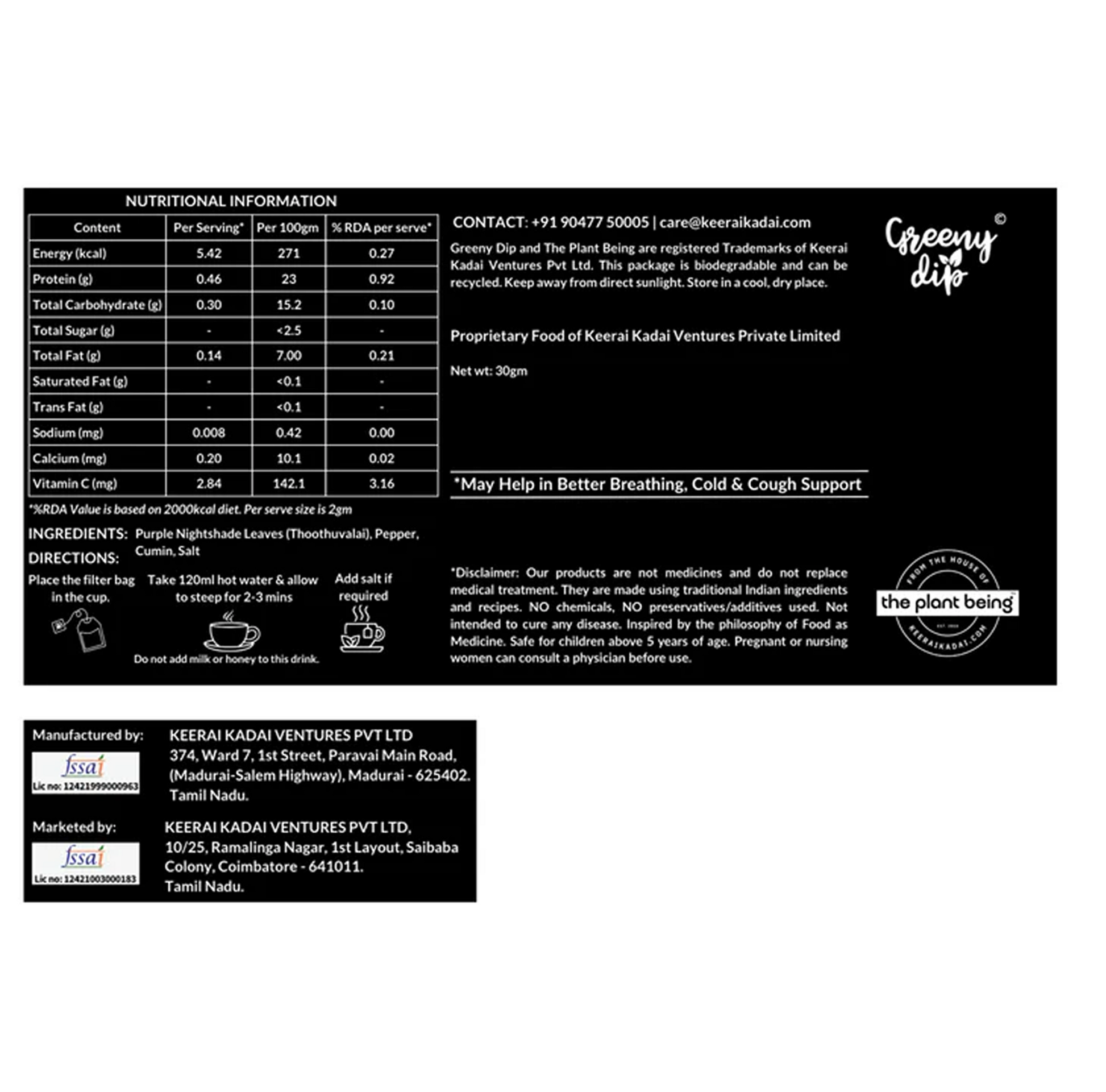(Dip Soup) Thoothuvalai Wellness Sachets (14-Day Pack) – Experience the healing power of Thoothuvalai Keerai (Purple Nightshade) in an easy-to-use wellness drink designed for today’s lifestyle. Traditionally used in Siddha and Ayurvedic practices, Thoothuvalai is known for its ability to clear mucus, support lung health, and relieve cold, cough, and throat discomfort..