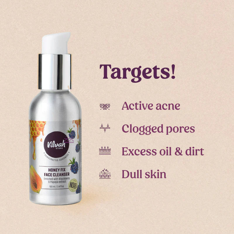 Vilvah honey face wash, Vilvah Honey Fix Face Wash, Vilvah face wash for acne prone skin, honey paste face cleanser product, honey face wash, honey face wash for acne, natural face wash for oily skin, face wash with honey & papaya, plant-based face wash for acne, honey face wash benefits, witch hazel face wash for acne, papaya extract skin brightening, glycolic acid natural face cleanser, raw honey cleanser for glowing skin