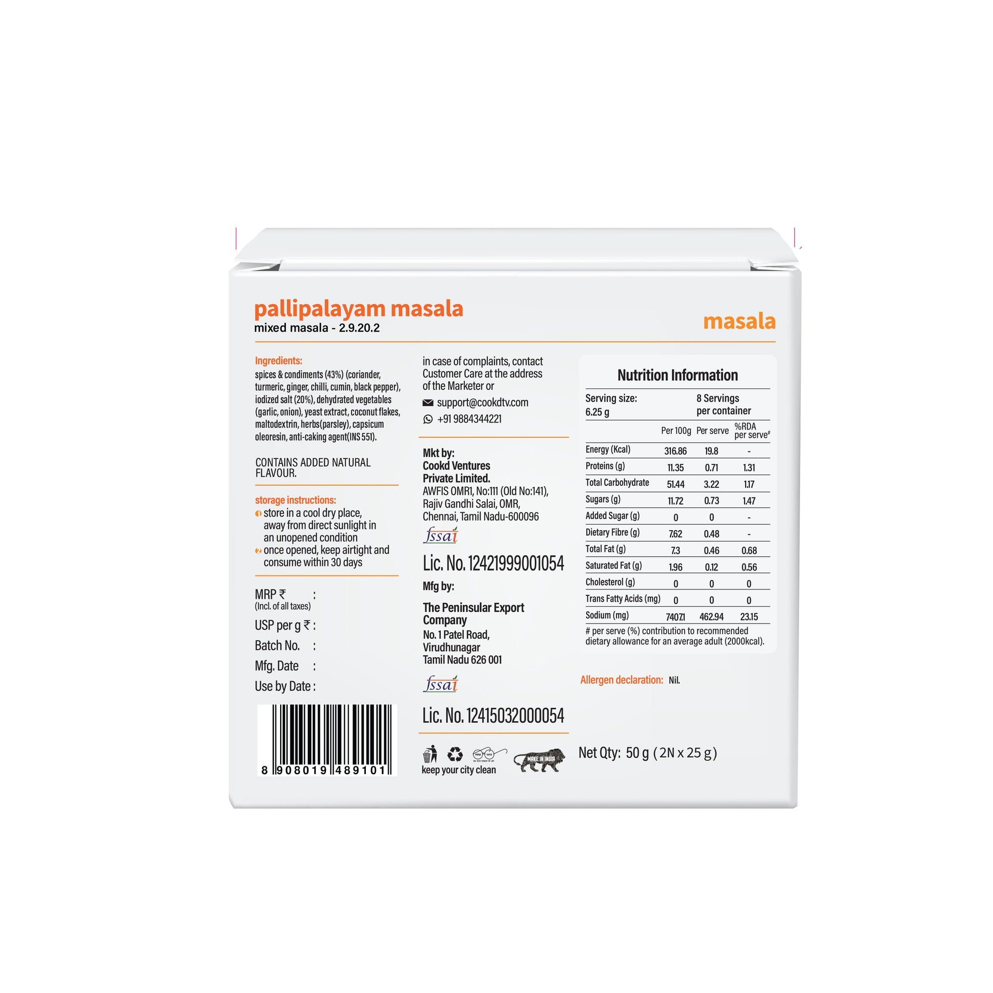 Pallipalayam Masala - Cookd Pallipalayam Masala blends the right quantity of red chillies, garlic, curry leaves and aromatic spices to help you recreate the iconic Kongu-style flavour. Pre-measured, fresh, and perfectly balanced, authentic Pallipalayam taste made easy in every pack.